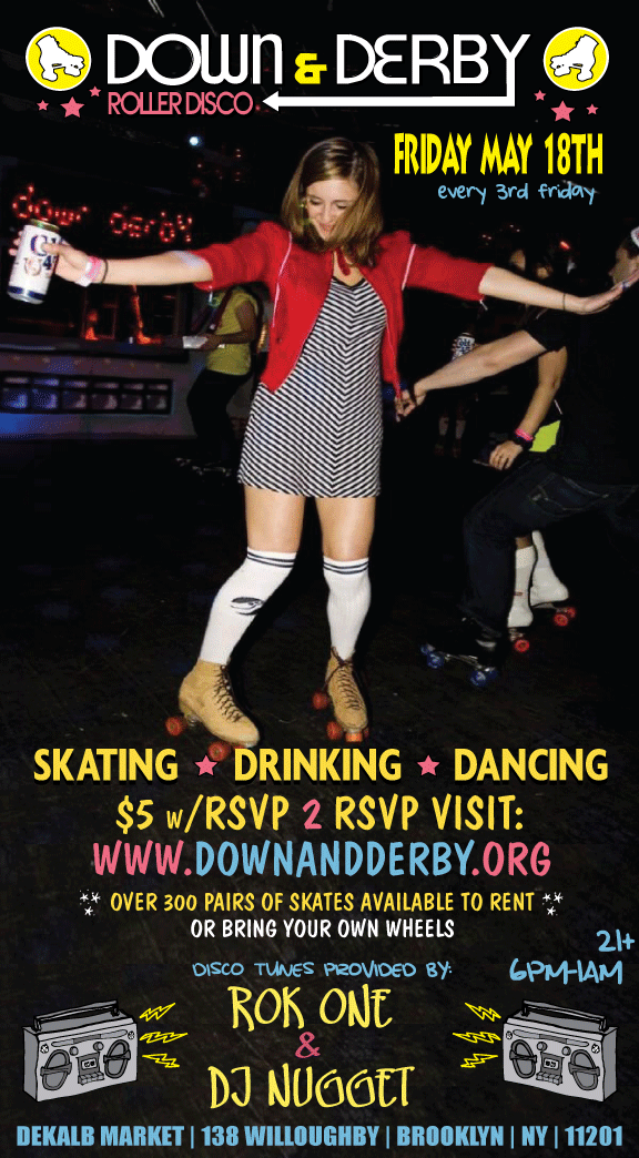 YES – they are back! Down & Derby Roller Disco has found it’s new home at DeKalb Market in Brooklyn! Every 3rd Friday throughout the Summer, starting May 18th, Down & Derby will be hosting it’s Skate, Dance, Drink parties. The parties begin at 6pm and the entrance fee is $10 at the door. By RSVP’ing in advance, entrance is only $5 and you can RSVP up until 1pm the day of. You can bring your own skates or you can rent an old school pair for $5. I recommend getting there on the earlier side to not only ensure your entrance and a pair of skates but to also get some practice in before the party really kicks in! Have fun! I’ll see you there in June!