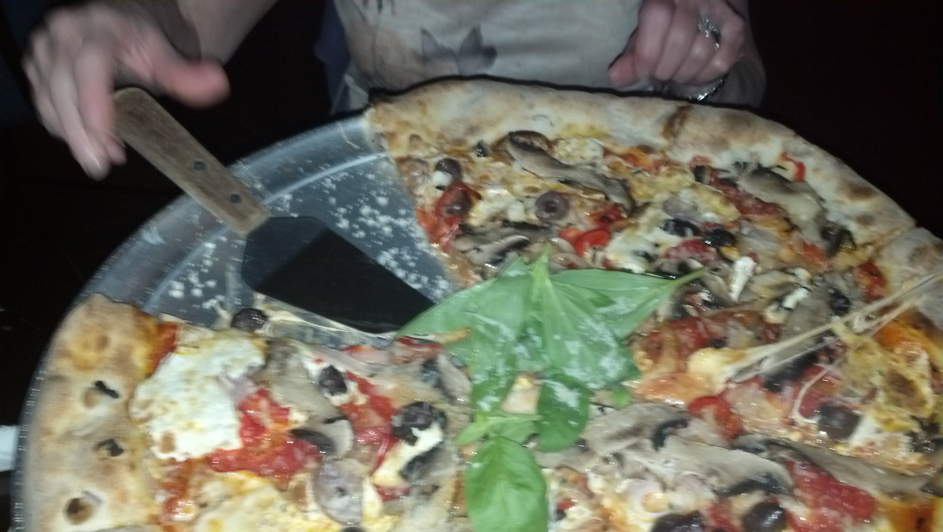 So! About the pizza…. It was good. I had the veggie pie under the list of “specials” and for $36 I expected it to blow me away. I say “good” because I love that it is brick oven cooked and I love that it is thin crust but there was something missing in the sauce… it was a little too bland for my taste. There is a good ratio of sauce to cheese and the crust is just thick enough to keep it all together without falling through. Jayson had a pepperoni w. mushroom pie and enjoyed it; so much he had the leftovers for dinner the next night.