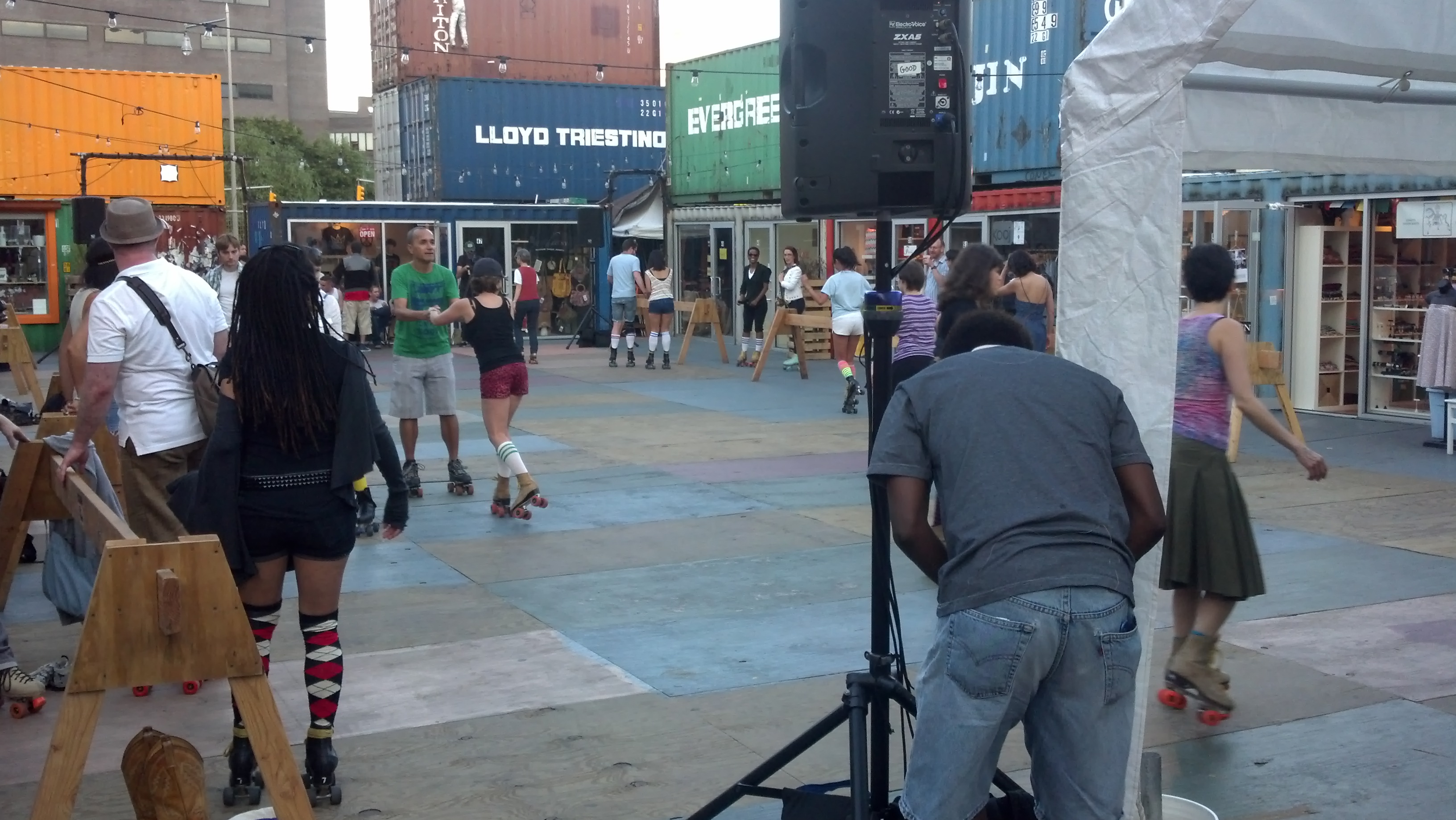 The DJ’s were spinning, the beer and wine were flowing, food was offered, but the best part of this venue vs. the basement of the Hudson Hotel is exactly that – we were outdoors under the summer stars rather than being in a basement. The “rink” is a bit smaller than the one at the Hudson but it doesn’t get slippery from the spill over of the drinks as it is made of large pieces of ply wood rather than a polished wooden floor. I’d hate to be negative but this type of floor has its cons to it as well. It isn’t completely smooth nor is it level where the pieces come together. But what makes is so great is how everyone is so excited about the idea of roller skating in the city. There were children, novices and long-time skaters all together on the floor, feeling the music and skating as well as they could. We arrived while it was still light and stayed until after it got dark. People were still coming in as we were leaving. Even if you aren’t in the mood to skate, Dekalb Market is a place to hang out outdoors chillin to some old disco tunes. And you might just get skating envy as you watch all of the fun on the “dance floor”.
