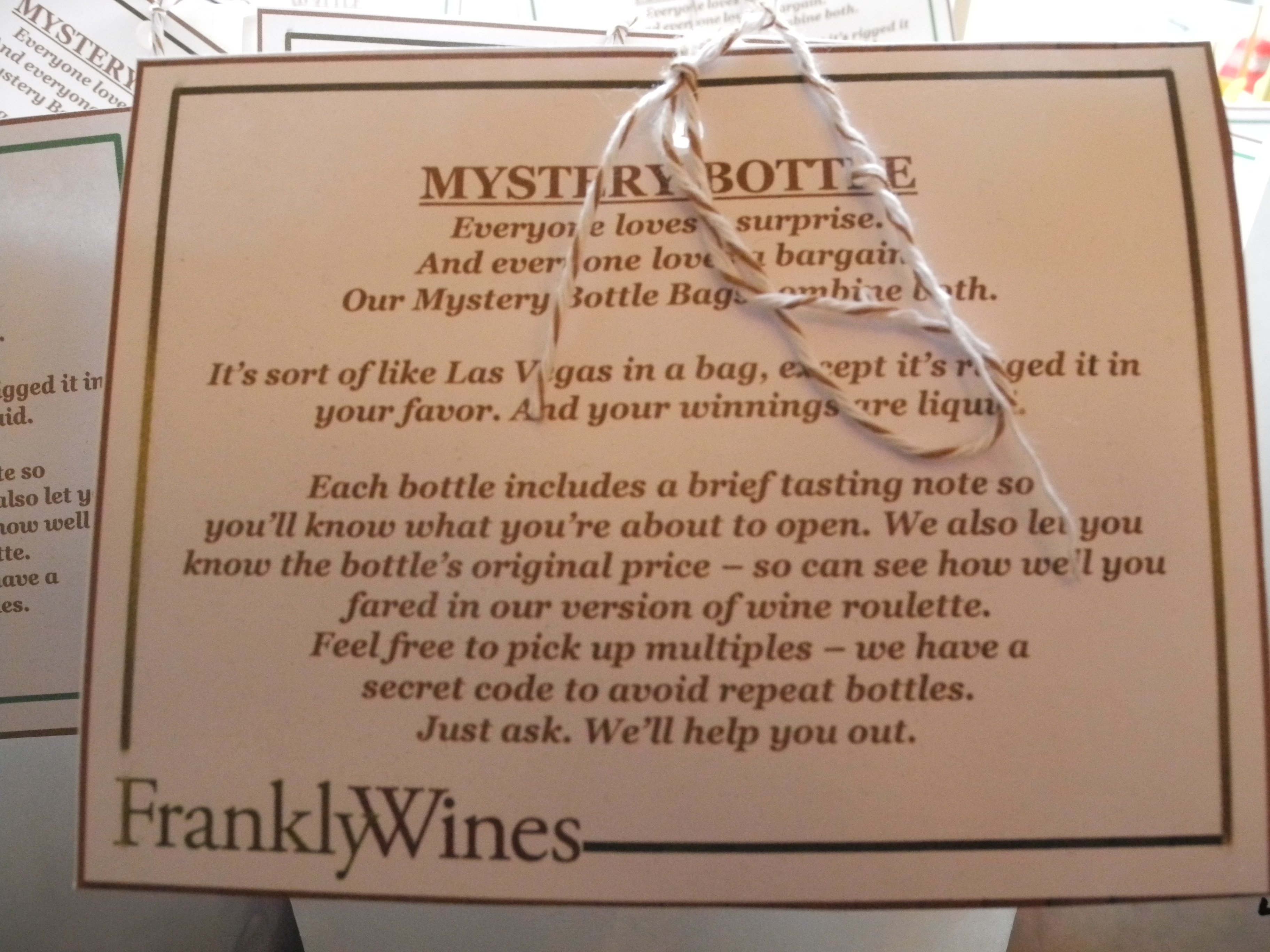 snack and I am already planning to swing by there this weekend after the gym!; and b) the mystery wine bag at Frankly Wines on West Broadway. It is exactly what it sounds like. For $20, you receive a wrapped bottle of wine that you have no idea as to what is inside. It could be a red wine or a white and it could be a $20 bottle or it could be a $80 – it is just that – a mystery.